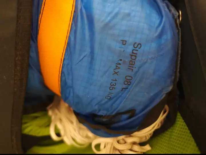 Sup'Air plus Max light 0.8L ptv 135kg (rare) Toujours replié avec, par des pro, chaque année Jamais ouvert en vol Stocké au sec et à l' abri de la lumière Livré avec pod, élévateur long et poignée de secours