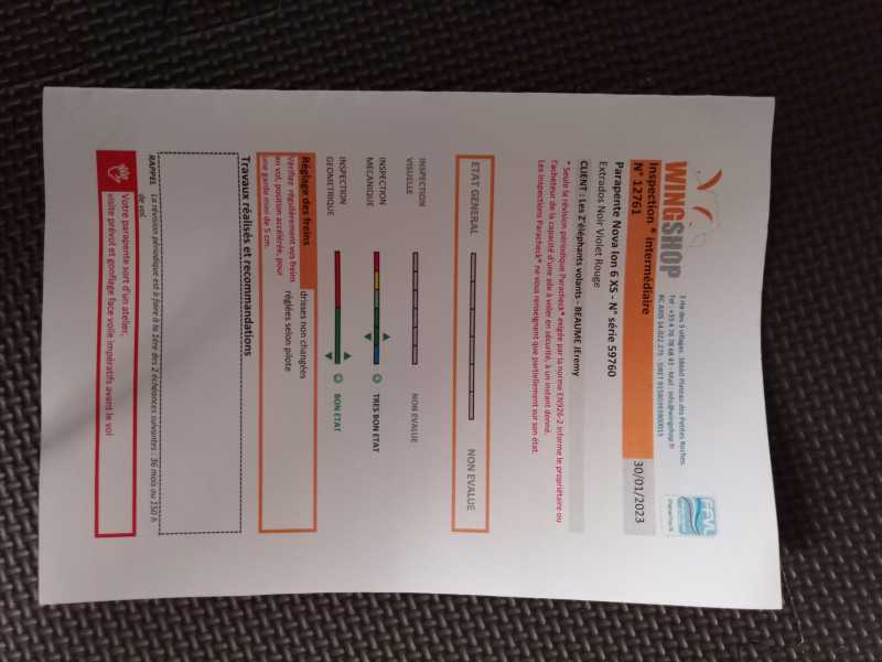 Aile NOVA ION 6, taille XS (PTV 70-90), allongement 5.19 Couleur sangria (rouge, violet, rose suivant à qui vous demandez :), cf photo) Prix neuve : entre 3300 et 3600 euros Je la vend avec : * son sac de portage NOVA (110L) qui venait avec (3 poches dessus, très pratique) * Le sac de compression NOVA de la voile * une chaussette de pliage paratroc que j'utilisais avec (trop grande pour ma nouvelle voile) C'est une toute petite EN-B (tout en A sauf 1 test), considérée par certains comme une "A+". Très tranquille en vol, 2 SIV effectué avec sans problèmes, sortie de 360 toute seule, pas de difficultés particulières. C'est une "A performante" qu'on m'a fait essayé en stage ! Ma première voile après un stage perf, elle m'a permis de bien progresser en toute sécurité, avec de meilleures sensations que ce que j'avais en école au début sous une vraie A. J'étais plutôt en haut de fourchette PTV (80-85 suivant les fois), et une vraie tendance à doubler les autres en transition (parfois sans accélérer). Après chacun aura son ressenti ! Achetée neuve en septembre 2021, je dirais environs 50 vols avec pour ~80h max. Révision intermédiaire faite en février, tout est parfaitement OK, RAS (et pas sortie du sac depuis évidemment ...). Le tissu n'a pas été vérifié parce que pas nécessaire (pas beaucoup de vols), je l'ai fait moi même (regarder le tissu ne nécessite pas d'outils particuliers), et aucun problème à signaler, voile en parfait état. Changée pour gain de perf (je passe sur une B+, nouveaux objectifs !) À venir voir sur Chambery et la région :) Si le sac ou la chaussette vous intéressent pas on peut s'arranger évidement :)
