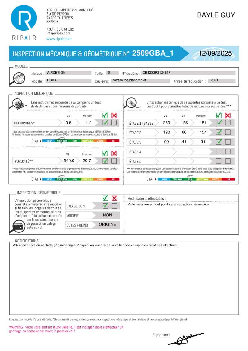 Annonce n°8511 : AIR DESIGN - RISE 4 - révisée - PTV 72/92 - Parapente AIR DESIGN RISE 4 S