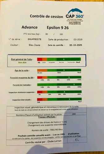 Je mets en vente ma voile Advance Epsilon 9 – 26 m², -En B, pour cause d’évolution de ma pratique. Caractéristiques : • Taille : 26 m² - PTV : 80-100 kg - Poids : 4,65 kg • Modèle : Advance Epsilon 9 • En B- • Fabriquée en mars 2019 Entretien / historique : • Achetée à un particulier en 2021 • Révisée par CAP‑360 dans leur programme révision post‑vente et mise sous scellé pour certifier le contrôle. • Aucun dommage majeur : un autocollant sur le stabilo gauche a été décollé, n’impactant pas les performances • Bon état général : tissu, suspentes et élévateurs vérifiés Accessoires inclus : • Sac de pliage Advance Flatbag DLS • Sac des élévateurs